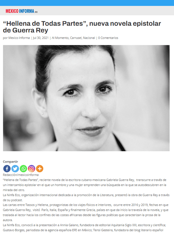 Escritora, periodista, investigadora y directora editorial de Editorial Aquitania Siglo XXI. Maestra en Letras por la UNAM. Ganadora en 2016 del premio Juan Rulfo a primera novela por Bahía de Sal. Ha publicado también las novelas: Luz en la piel, cinco voces de mujer y Hellena de Todas Partes.